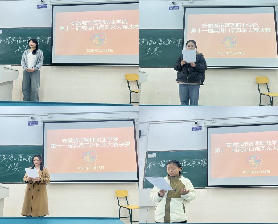 由公共教学部与成冠外语协会联合主办的安徽城市管理职业学院第十一届英语口语风采大赛于近日圆满结束。赛事自2025年10月底启动报名以来,历经初赛、决赛及颁奖仪式,历时近两个月,吸引了全校学生的广泛关注与参与。